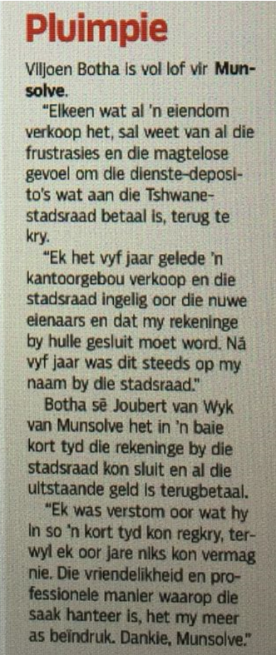 - Die grootste sukses was die regstelling van ‘n R17 miljoen elektrisiteits rekening na ‘n bedrag van ongeveer R 4 miljoen – ‘n groot verligting vir die eienaar.